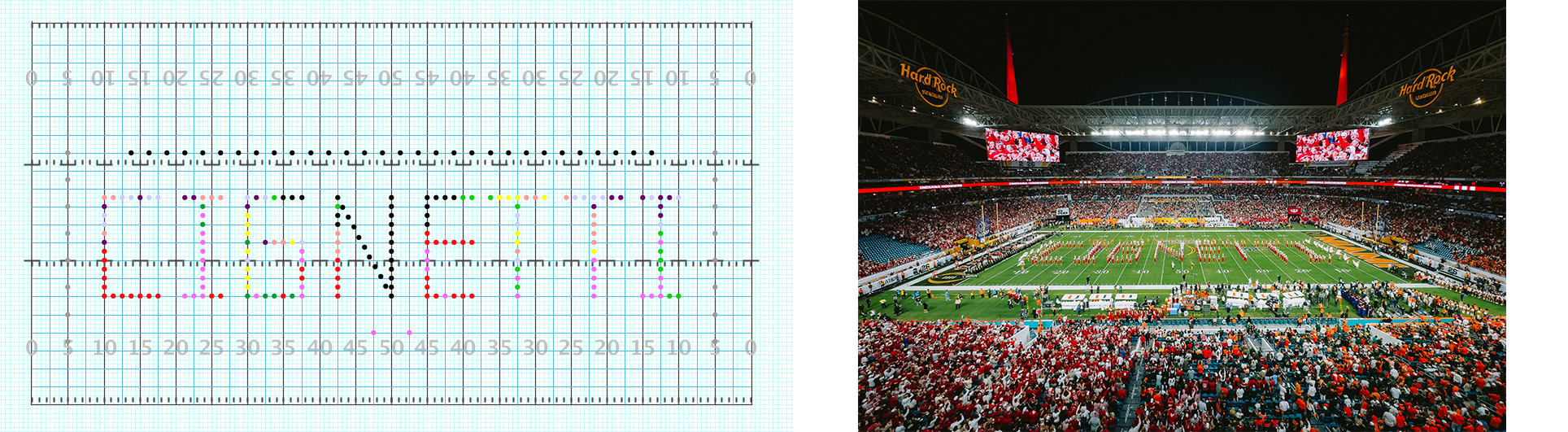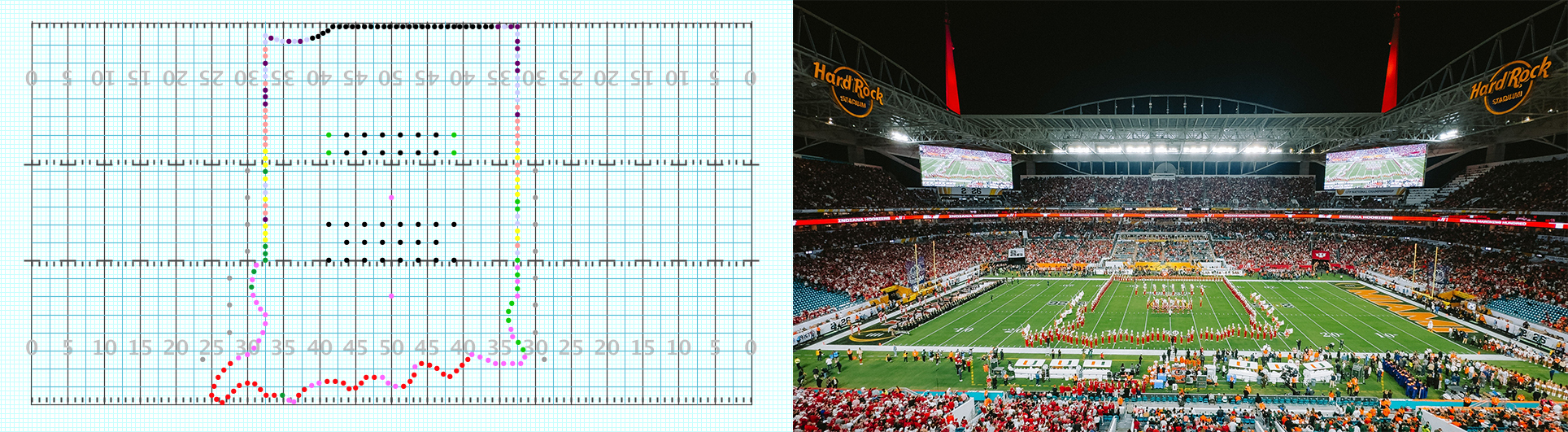 “Each of these postseason appearances had a different set of performance variables, fan engagement events, and entrance/exit parameters. By using Pyware to design formations and transitions for each event, it allowed each experience to flow seamlessly. I used Pyware not only to write and modify the drill to fit each event, but to also chart out ‘transitions’ into and out of each fan event and performance travel scenarios. By providing each performer with a transition location from their seats to the tunnels to the field, it allowed us to maximize our performance time on the field. Through recommendations from Dr. Christopher Hoch from Ohio State University, I also used Pyware to design and chart a ‘Nickerson-Style’ turn for the Tournament of Roses parade.”